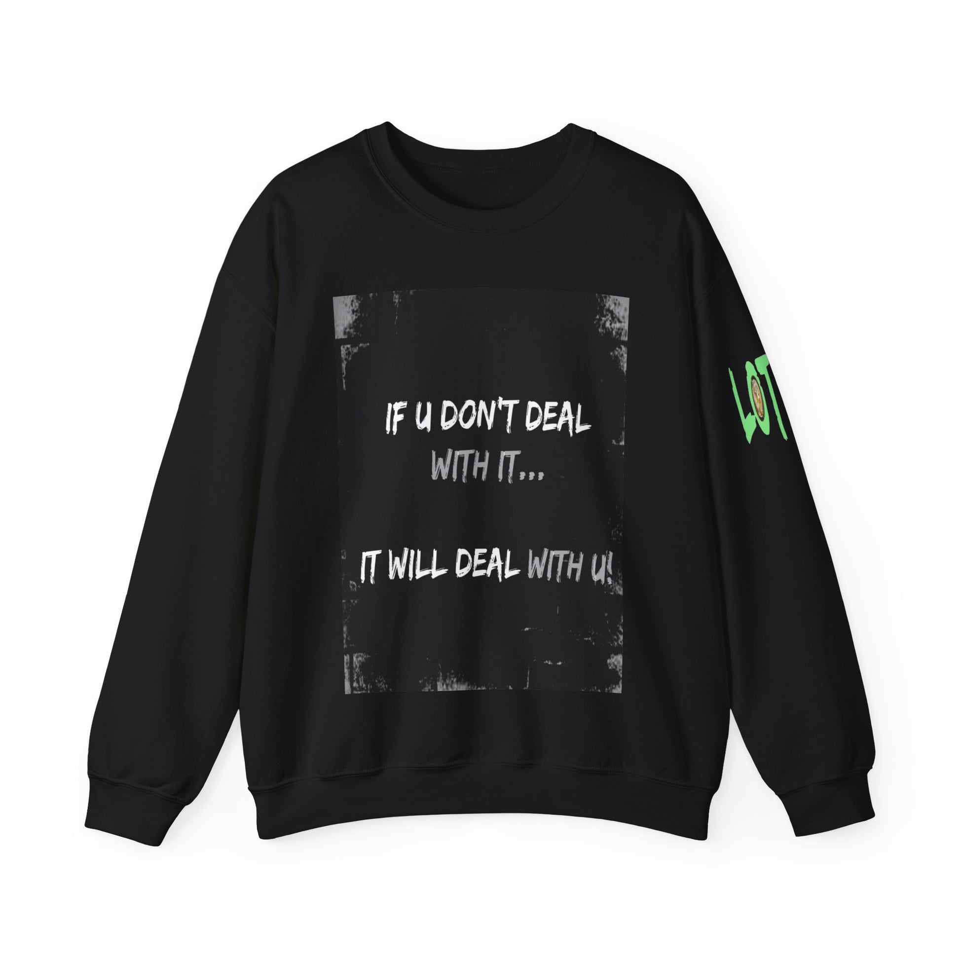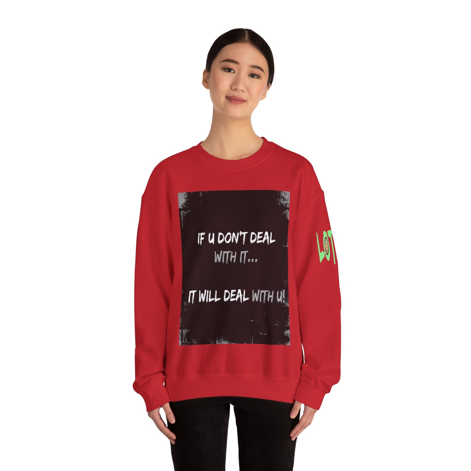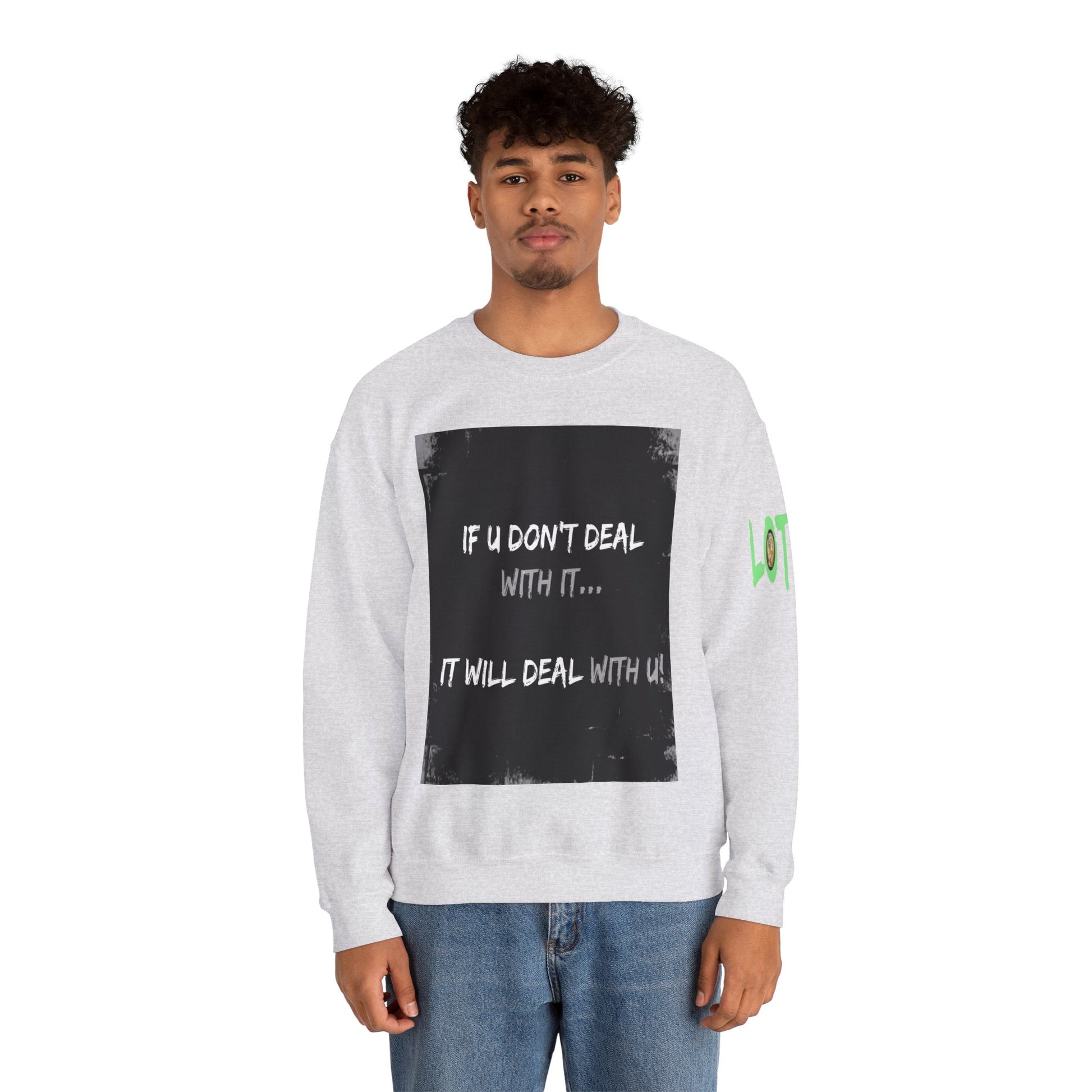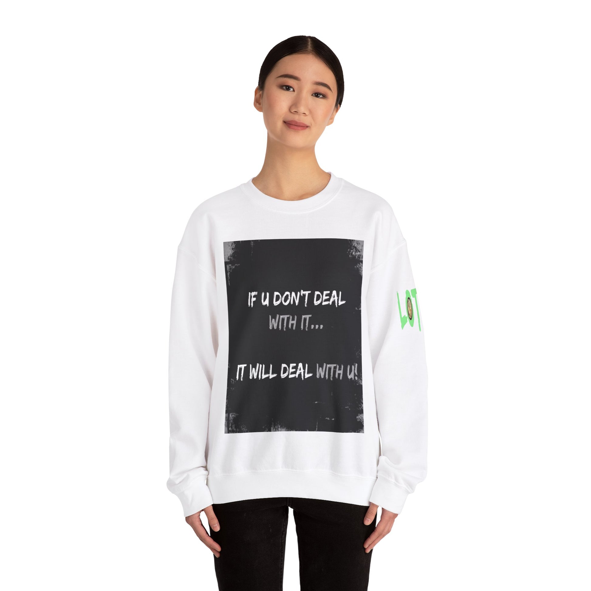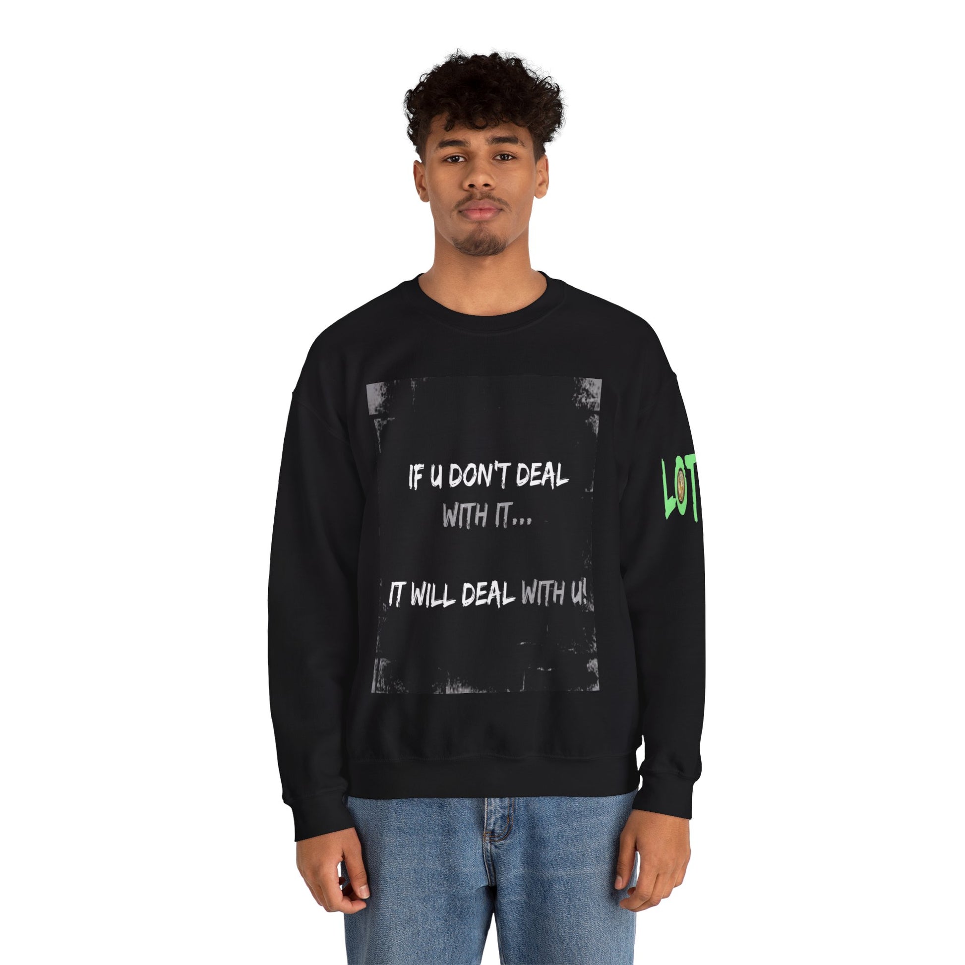 Get yourself wearing this; If U Don't Deal With It, It Will Deal With U | Unisex Sweatshirt with (LOTZOV) Logo left sleeve.Made with a medium-heavy fabric blend of 50% cotton and 50% polyester (8.0 oz/yd² (271.25 g/m²), this sweatshirt feels cosy and is perfect for those colder months.