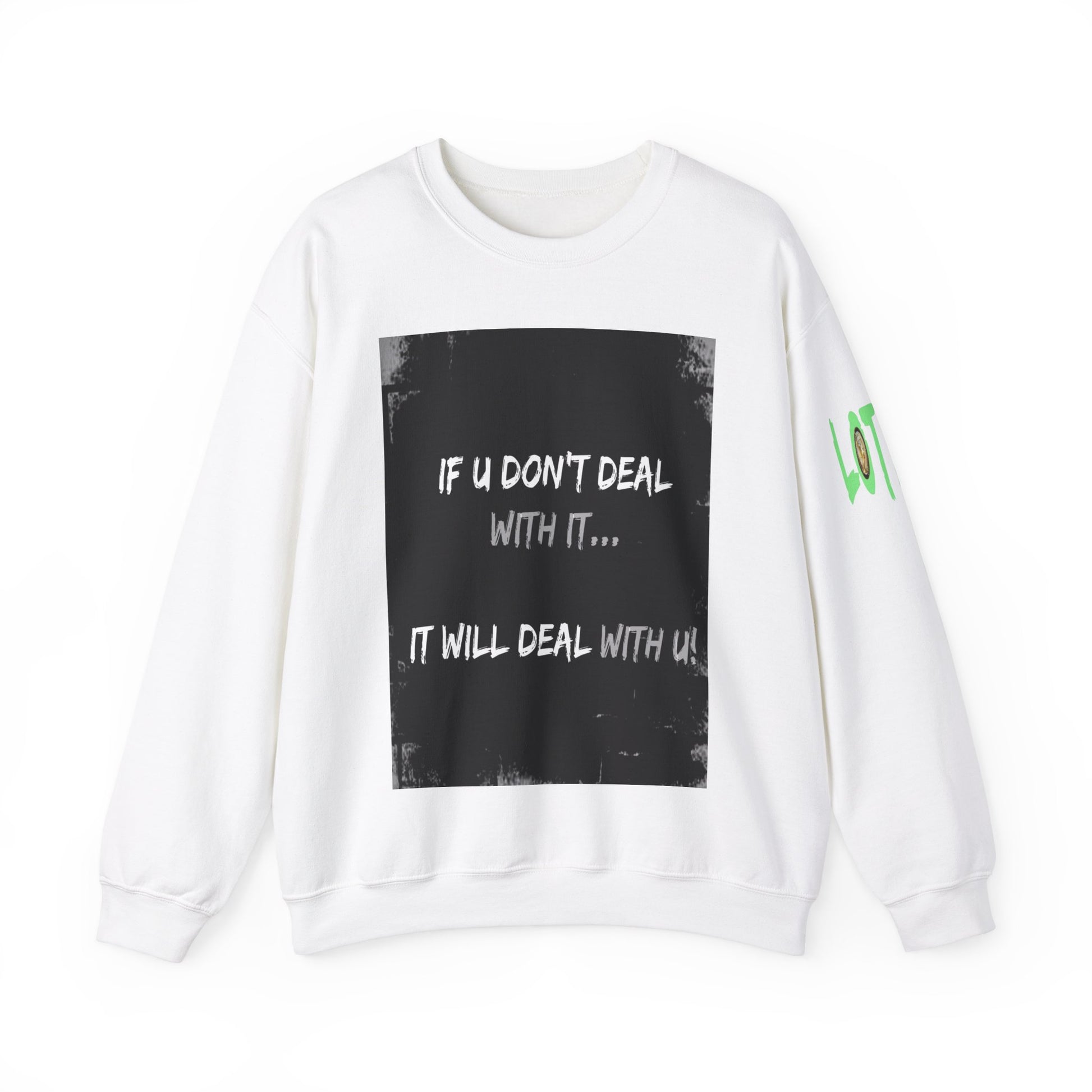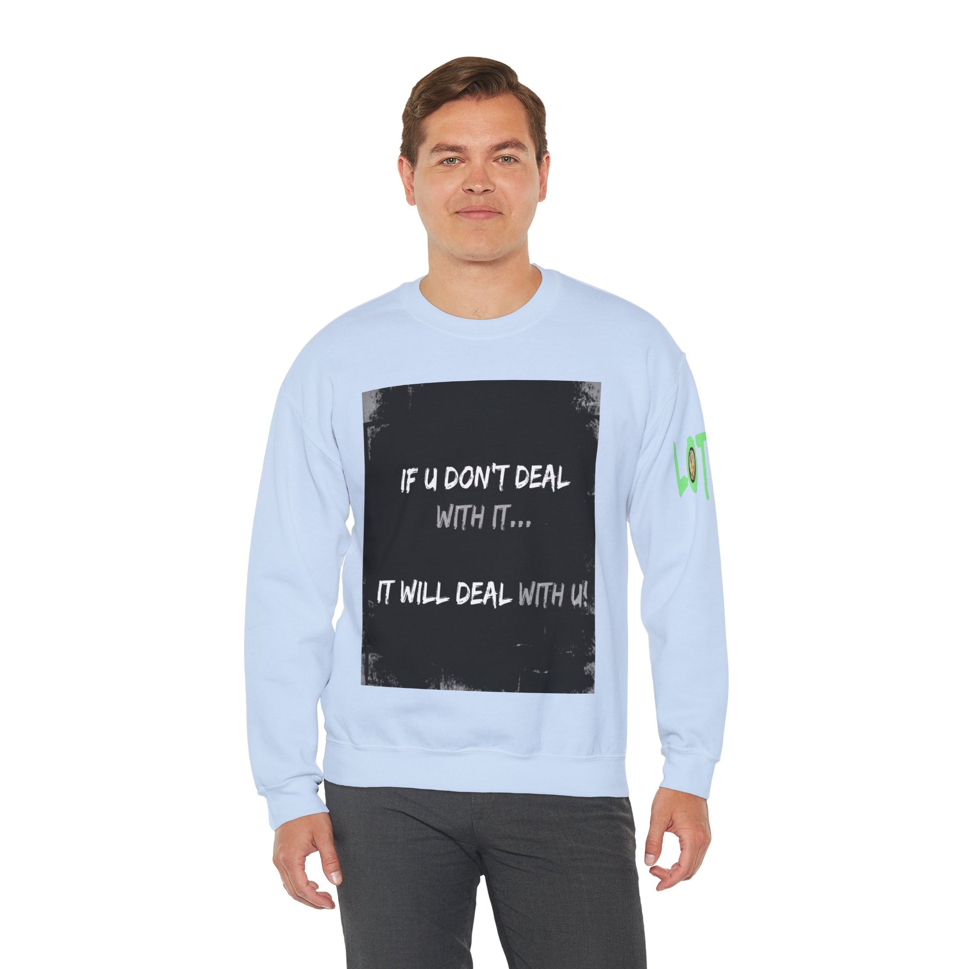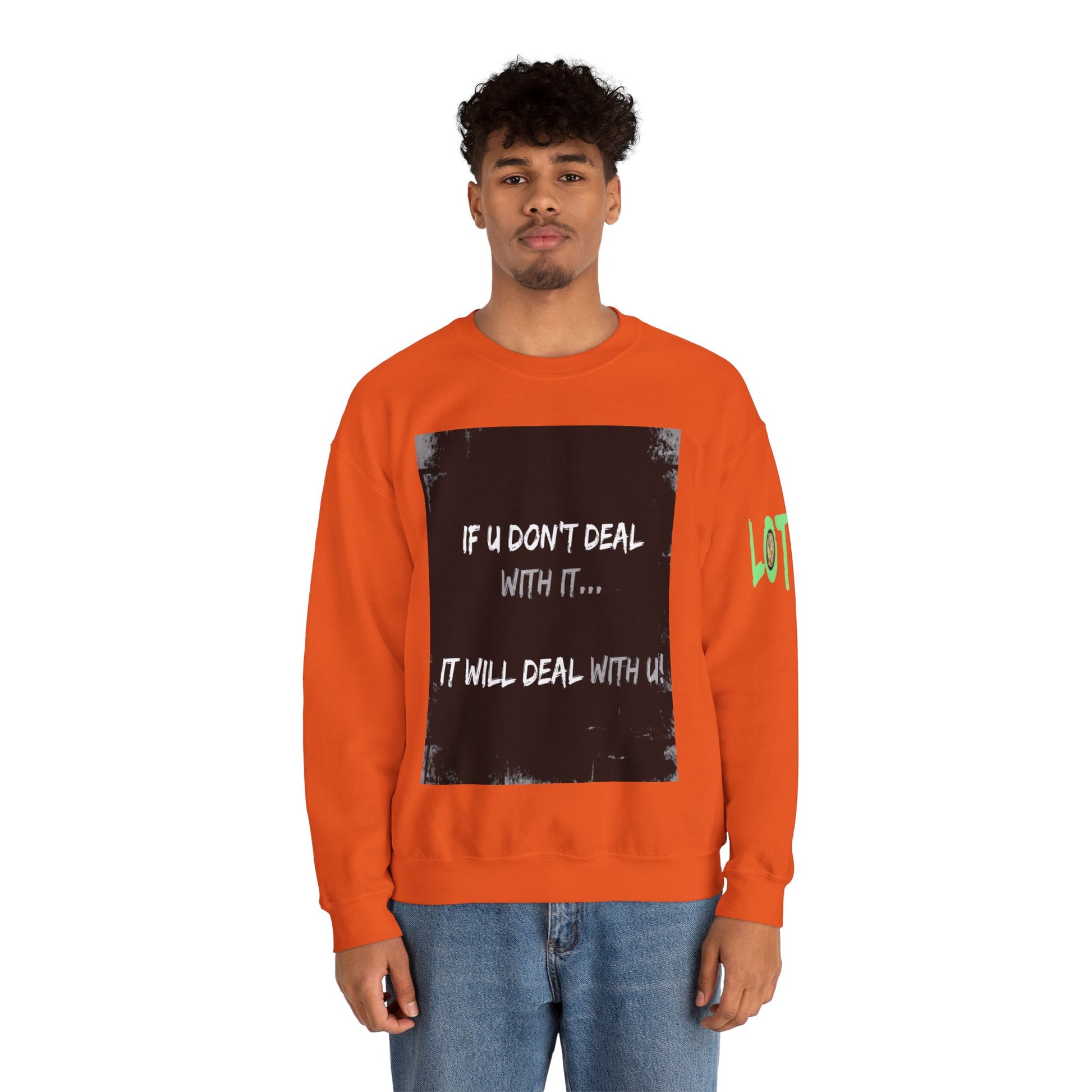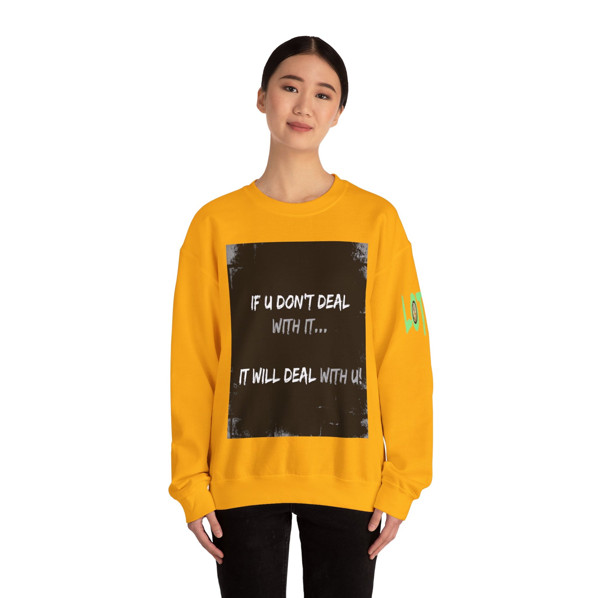 Get yourself wearing this; If U Don't Deal With It, It Will Deal With U | Unisex Sweatshirt with (LOTZOV) Logo left sleeve.Made with a medium-heavy fabric blend of 50% cotton and 50% polyester (8.0 oz/yd² (271.25 g/m²), this sweatshirt feels cosy and is perfect for those colder months.