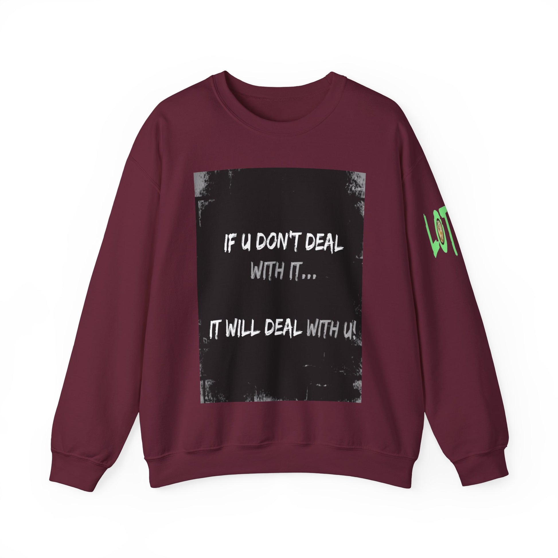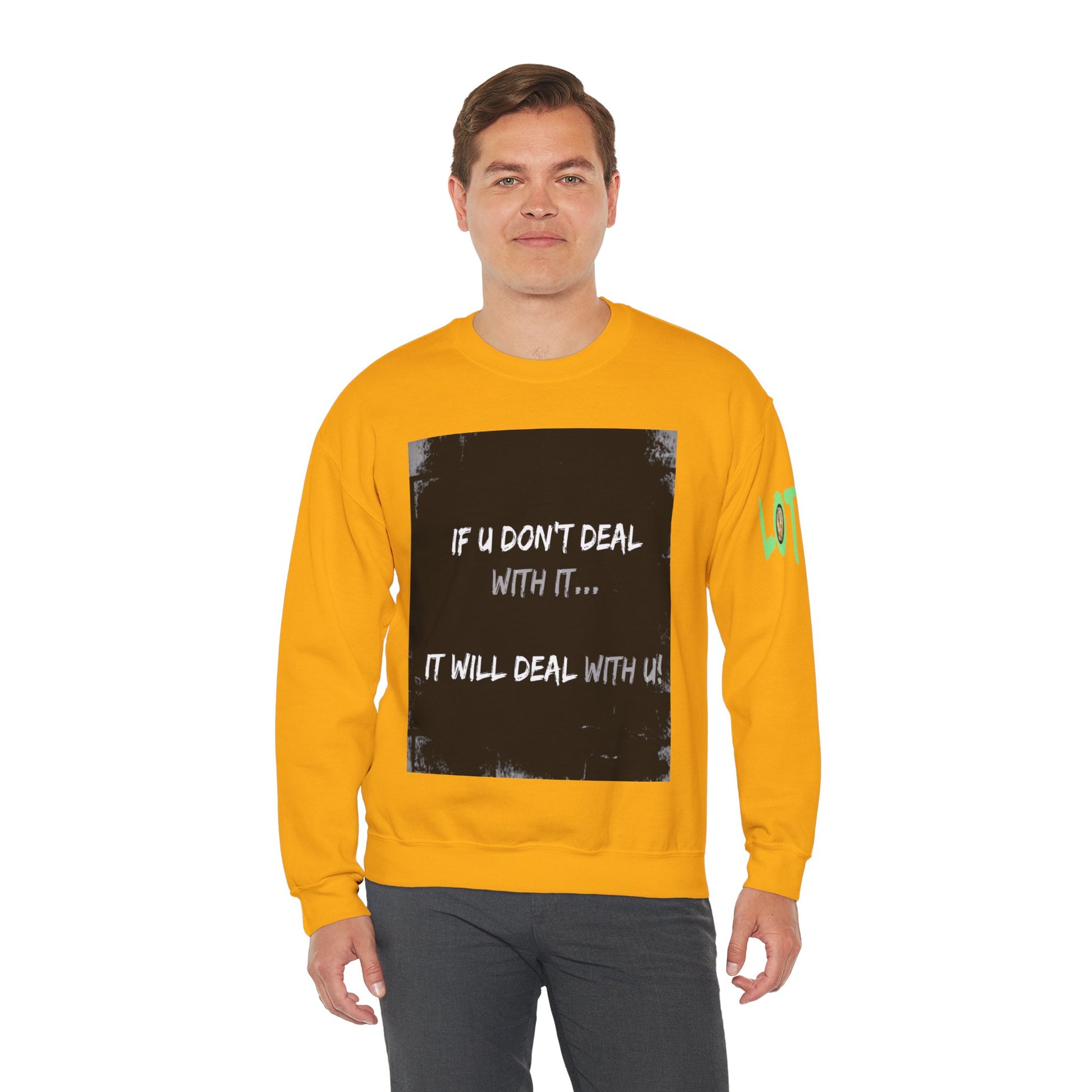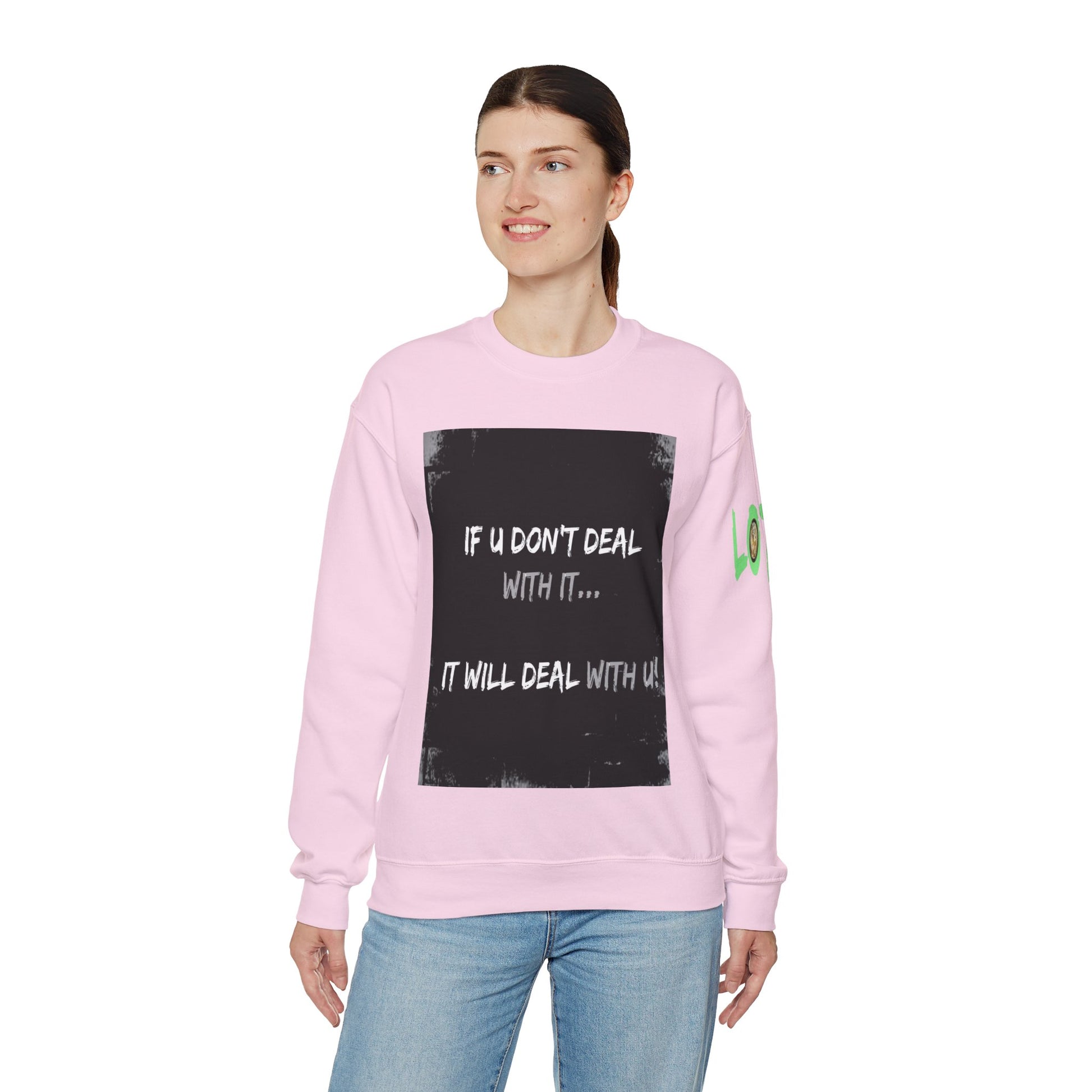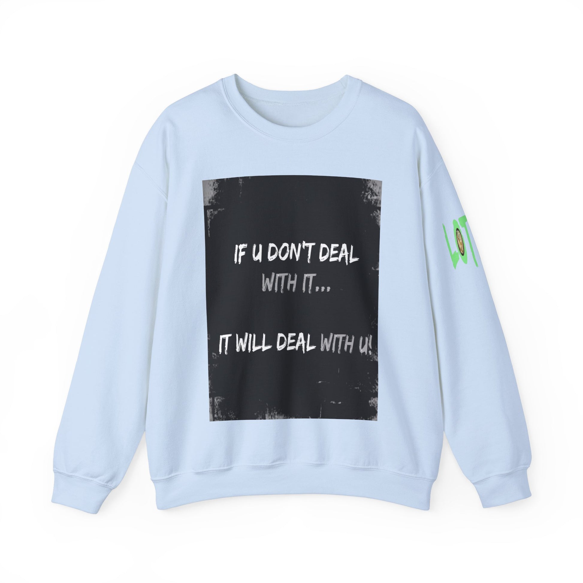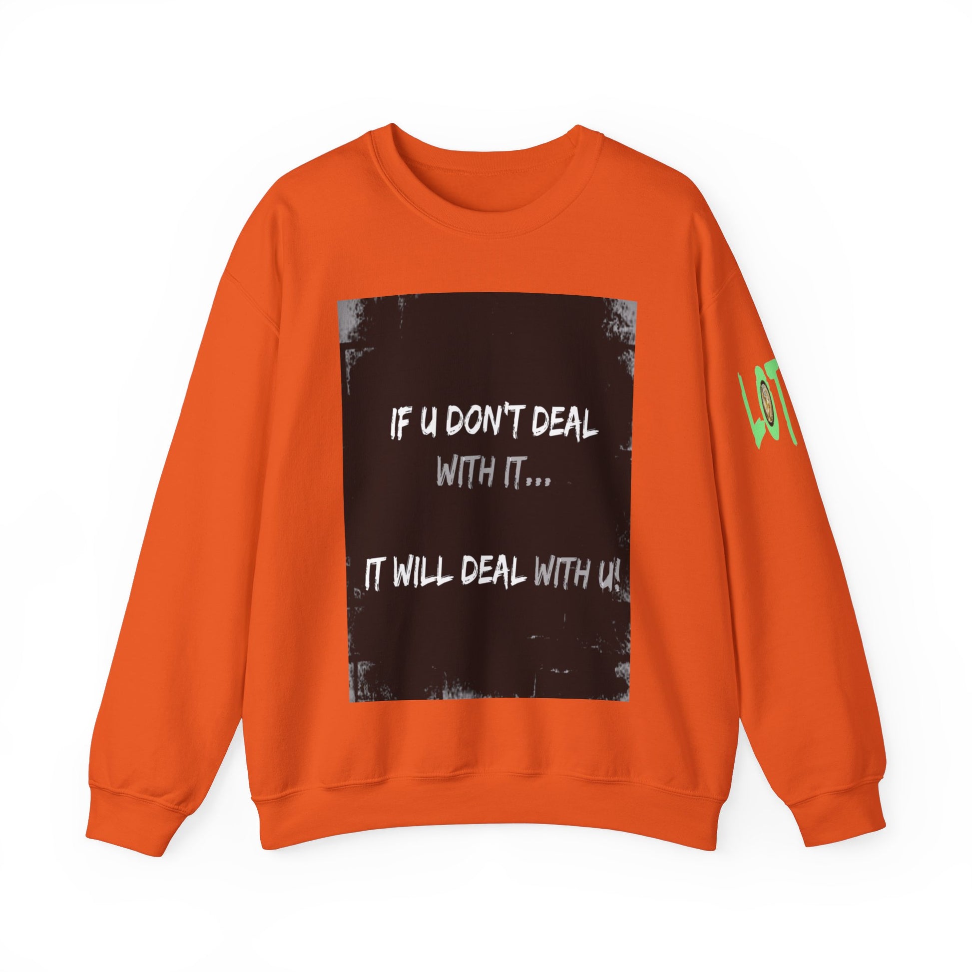 Get yourself wearing this; If U Don't Deal With It, It Will Deal With U | Unisex Sweatshirt with (LOTZOV) Logo left sleeve.Made with a medium-heavy fabric blend of 50% cotton and 50% polyester (8.0 oz/yd² (271.25 g/m²), this sweatshirt feels cosy and is perfect for those colder months.