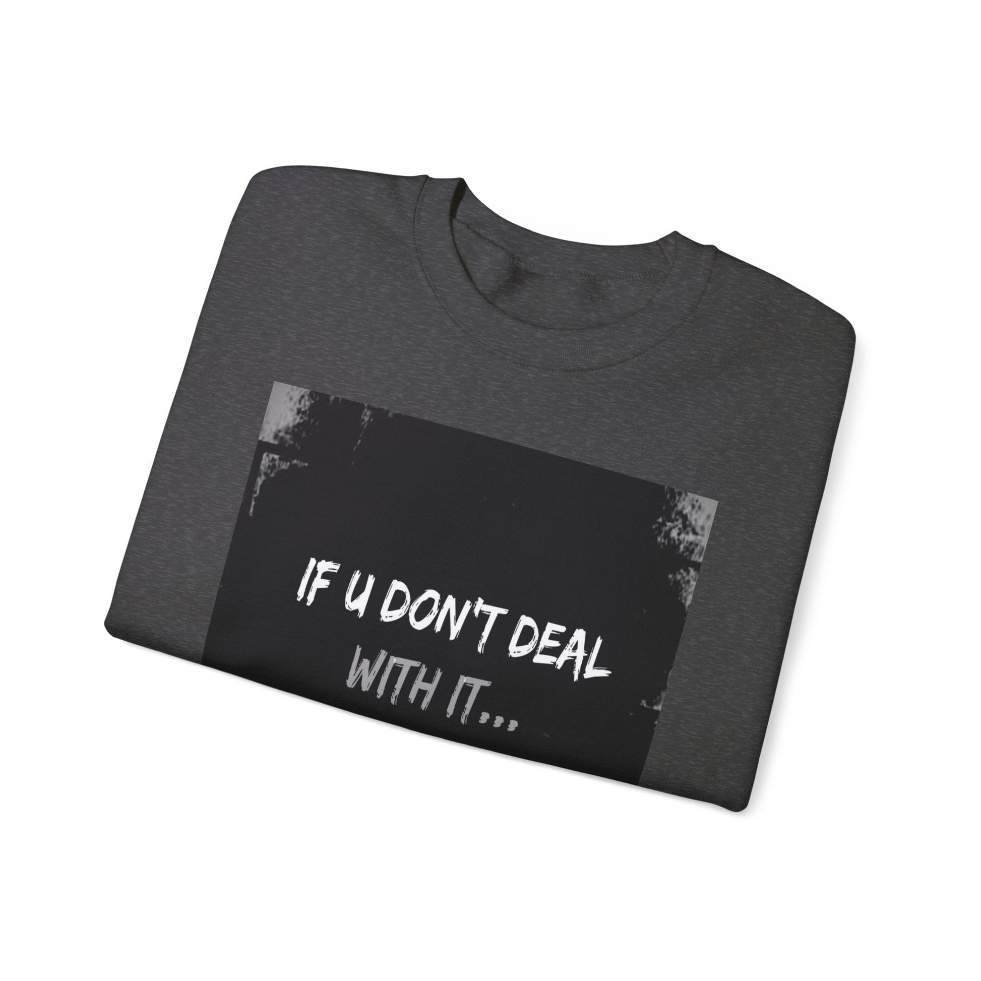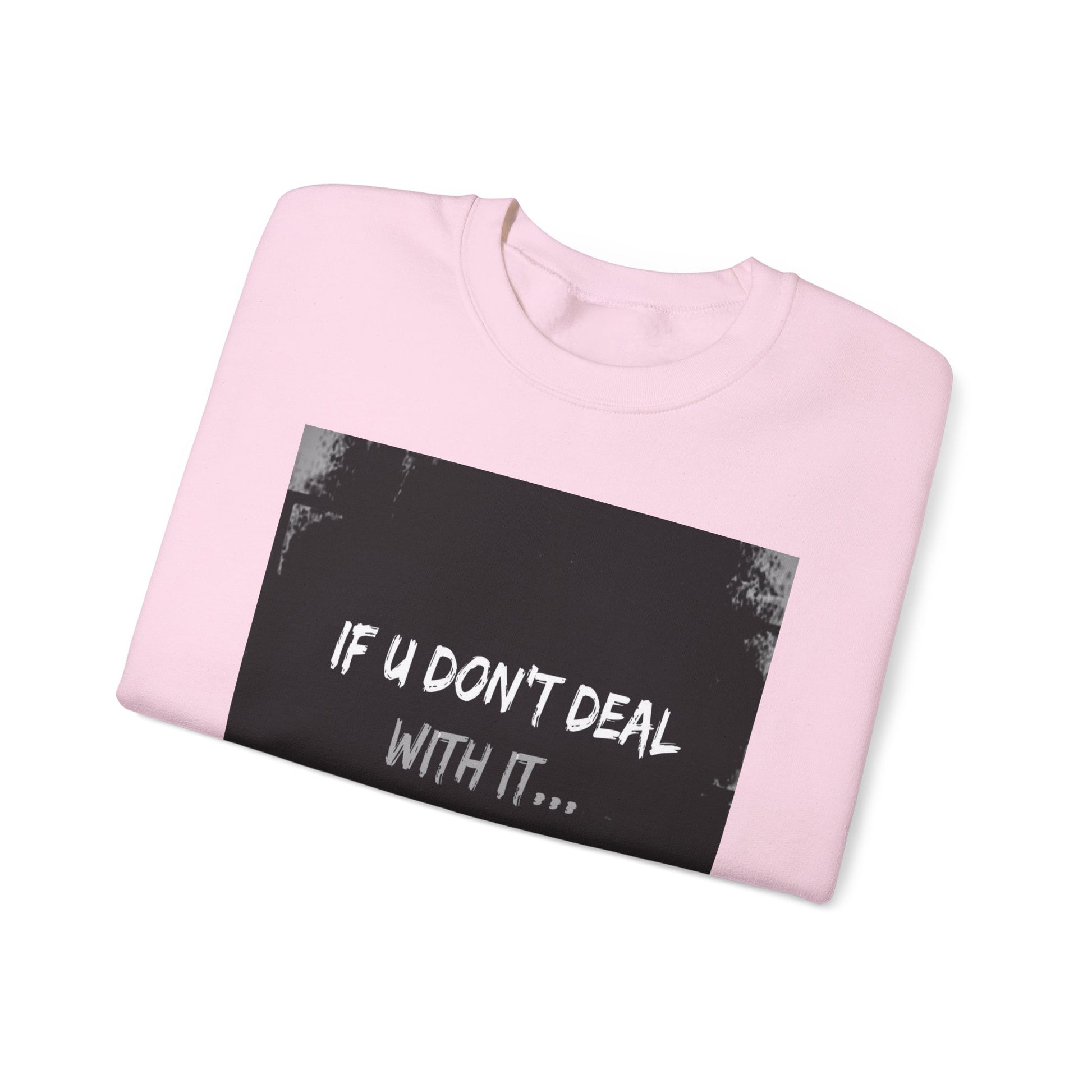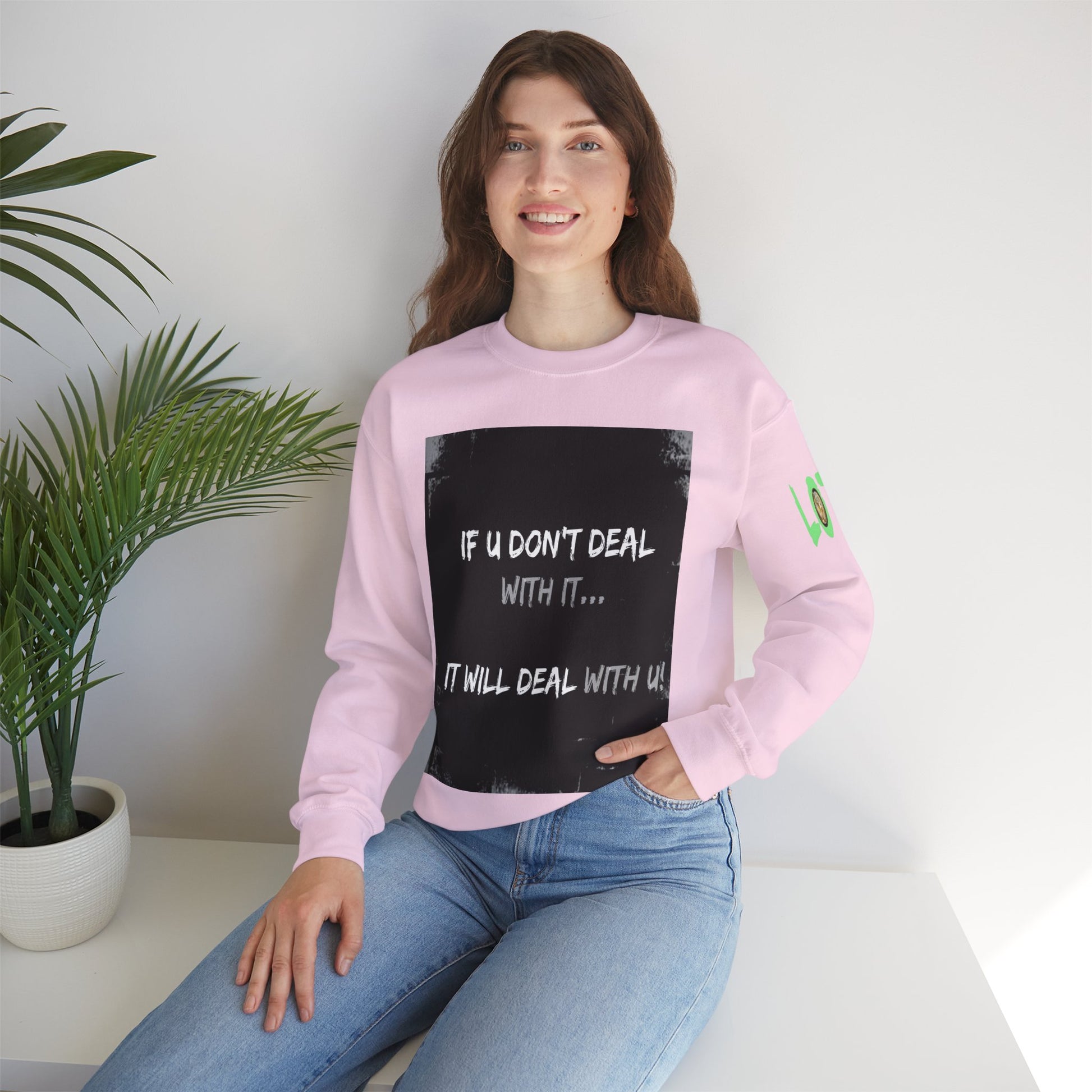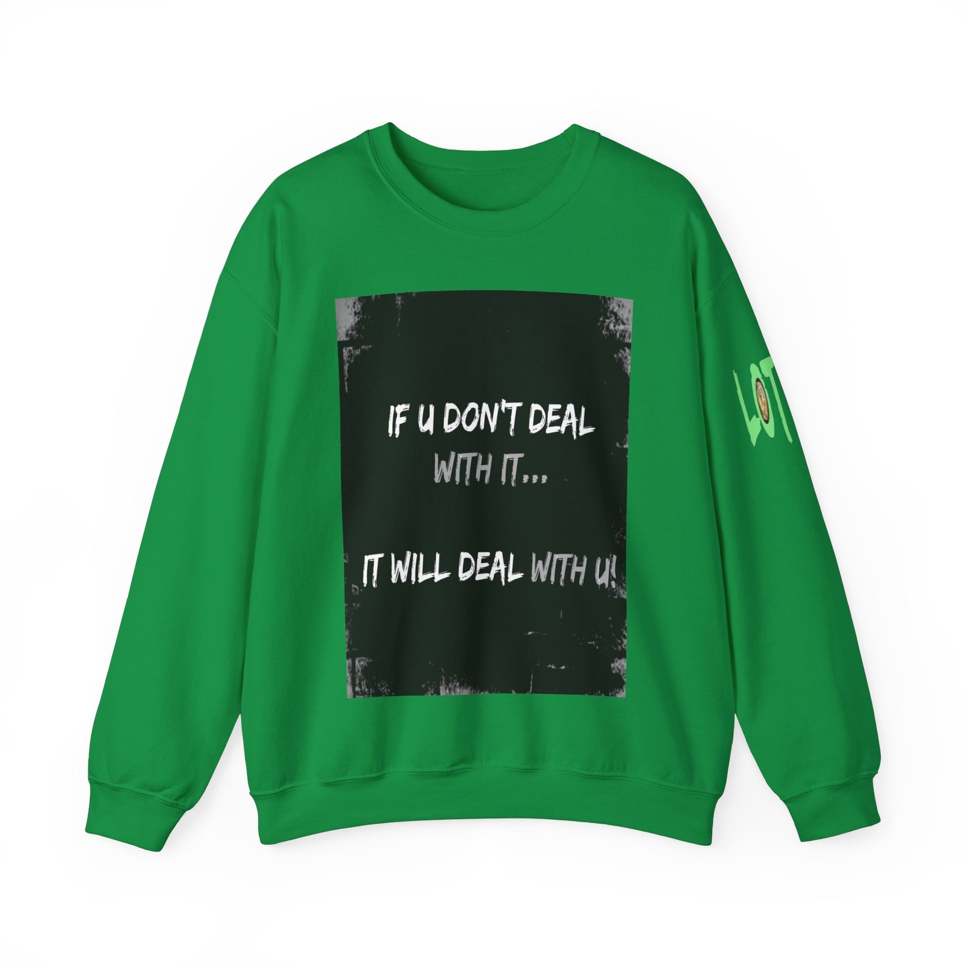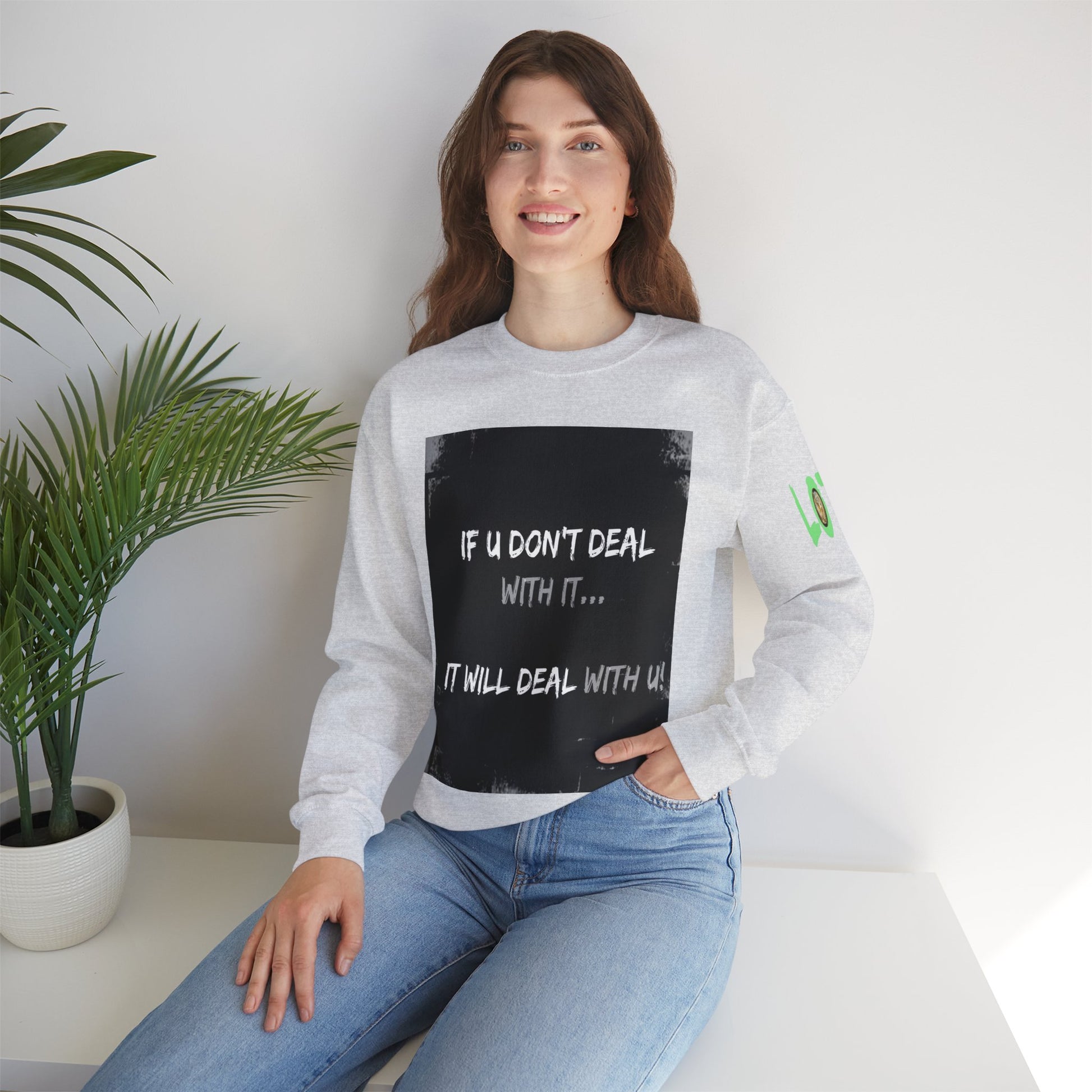 Get yourself wearing this; If U Don't Deal With It, It Will Deal With U | Unisex Sweatshirt with (LOTZOV) Logo left sleeve.Made with a medium-heavy fabric blend of 50% cotton and 50% polyester (8.0 oz/yd² (271.25 g/m²), this sweatshirt feels cosy and is perfect for those colder months.