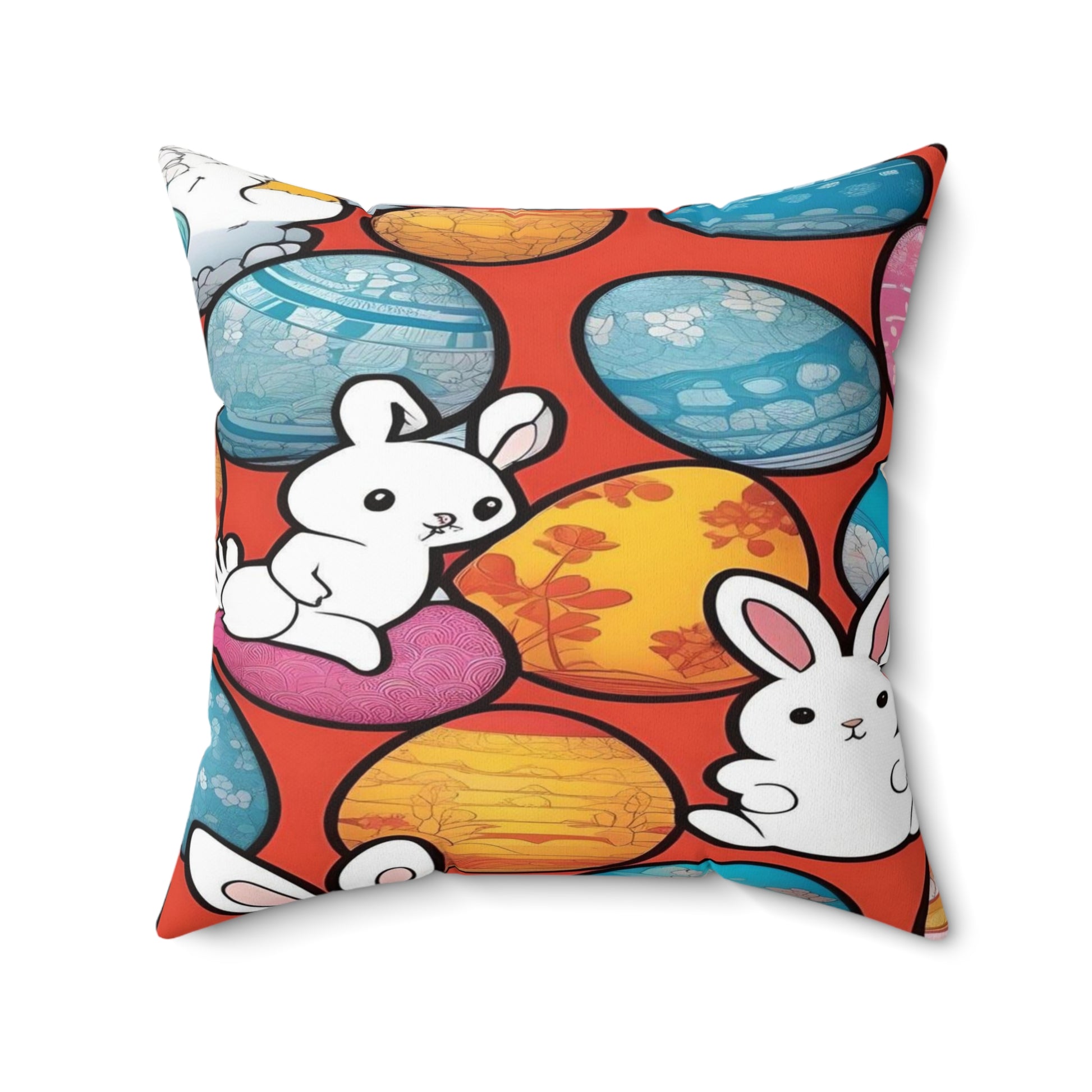 Elevate your décor and comfort with this: White Rabbits, Eggs Galore | Spun Polyester Square Pillow. Crafted for style and softness, it's the perfect addition to any space. .: 100% Polyester cover .: 100% Polyester pillow included .: Double sided print .: Concealed zipper